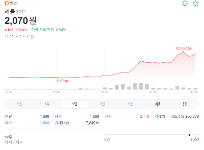 리플은 3년간 넘지 못했던 1달러 선을 돌파하면서 시장에서 강력한 상승 모멘텀을 형성했습니다. 이는 기술적 강세를 입증하는 중요한 지표로 평가됩니다.