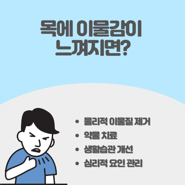 이물감이 며칠 이상 지속되거나 통증, 삼킴 장애, 호흡 곤란 등의 증상이 동반되면 의료진의 진료를 받아야 합니다.