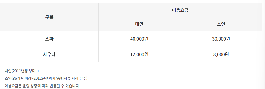 - 스파 : 성인 40,000원 / 소인 30,000원