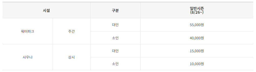 - 워터파크 : 대인 55,000원 / 소인 40,000